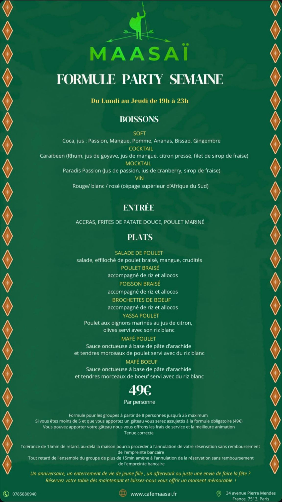 Nous proposons une formule étudiante à 29€ par personne, valable du lundi au jeudi, de 12h à 23h.